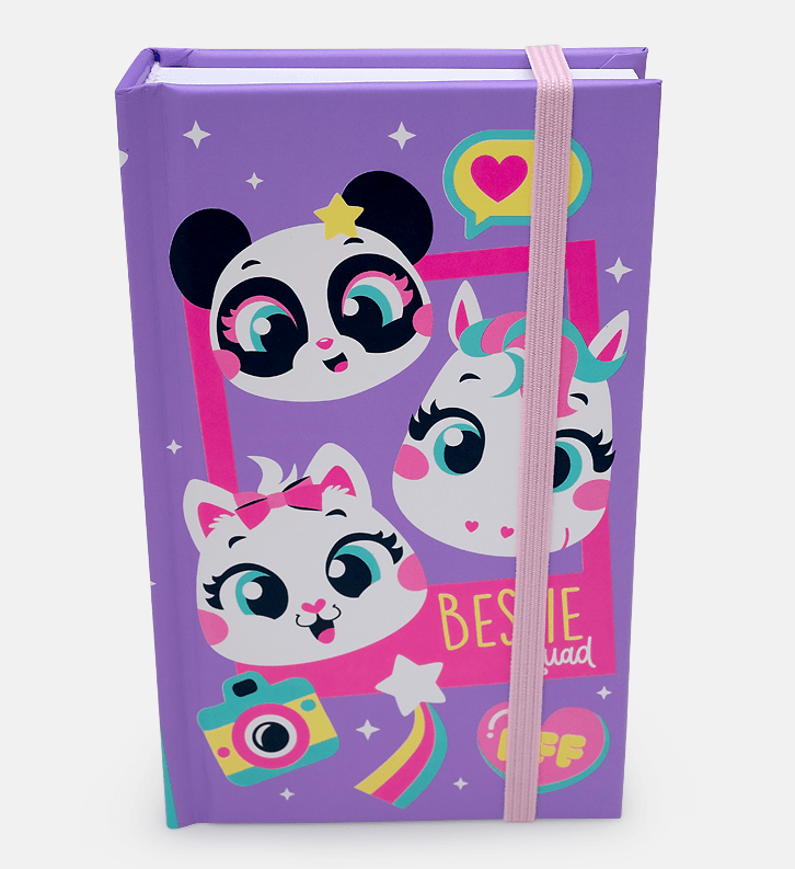 Caderno com capa dura e encadernação tipo brochura. Capa com estampa localizada de Multibichos. Possui 144 páginas com pauta e detalhe de elástico para fechamento.