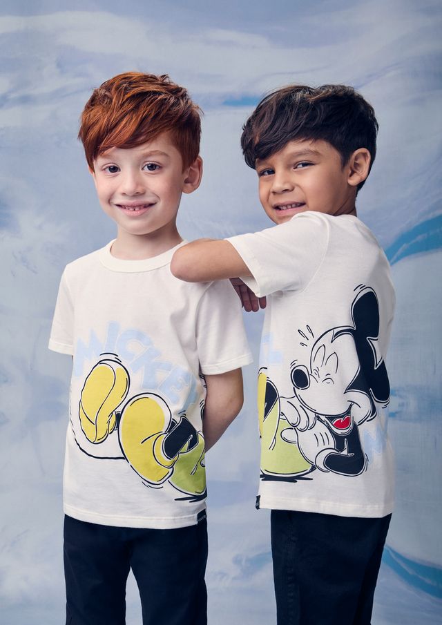 Com uma proposta cool e descontraída, a camiseta off white ganha destaque com a estampa frente e costas do Mickey, em tons vibrantes que criam um visual divertido e atemporal. A modelagem confortável é ideal para acompanhar os pequenos em todas as aventuras.