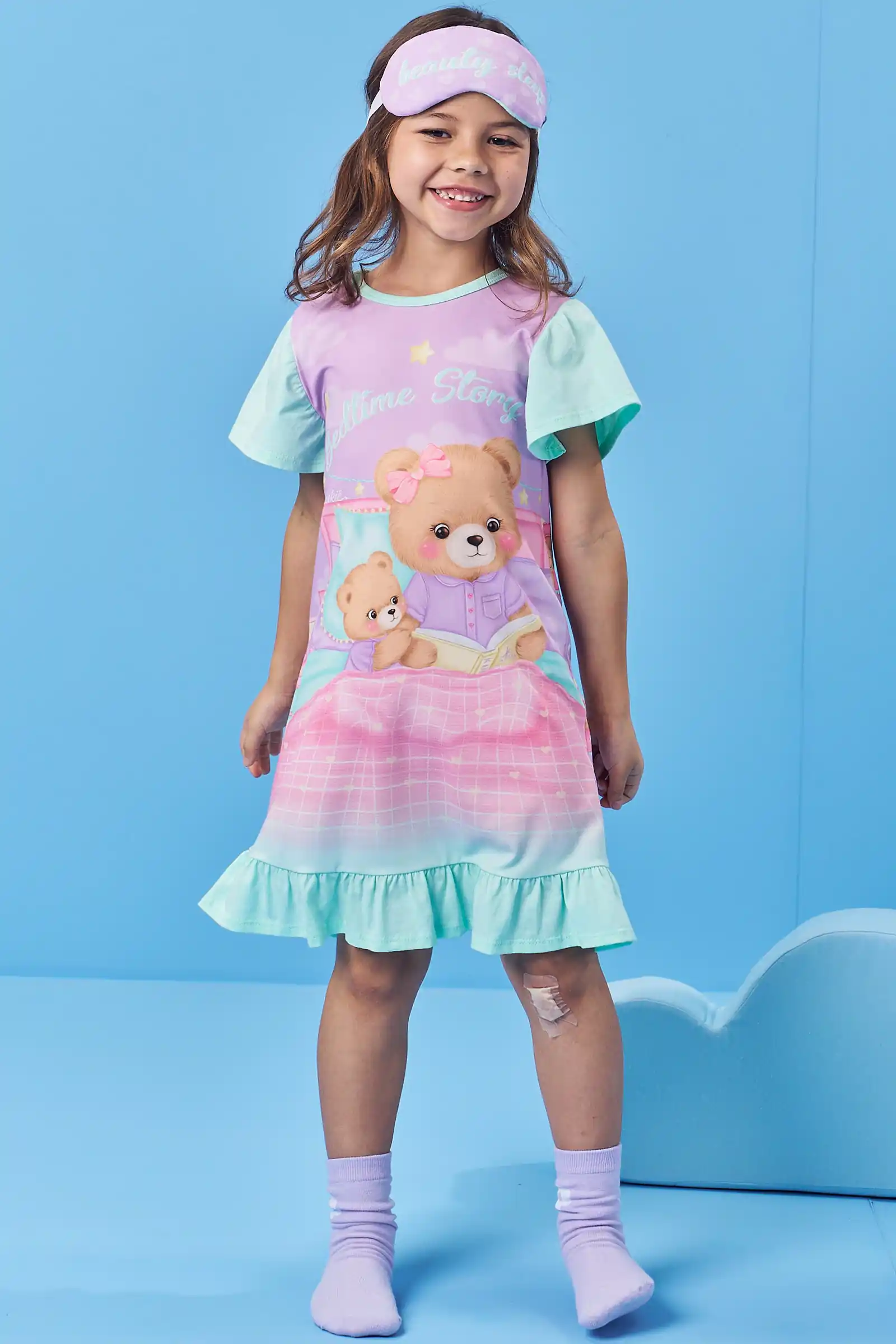 Proporcione noites tranquilas e cheias de histórias com a Camisola Kukie Pijamas em malha comfy. Com um encantador fundo lilás e estampa de ursinhos lendo uma 'Bedtime Story', esta camisola possui mangas e barra em tom menta. Acompanha uma máscara de dormir com 'beauty sleep' bordado, ideal para sonhar com aventuras e um sono profundo.