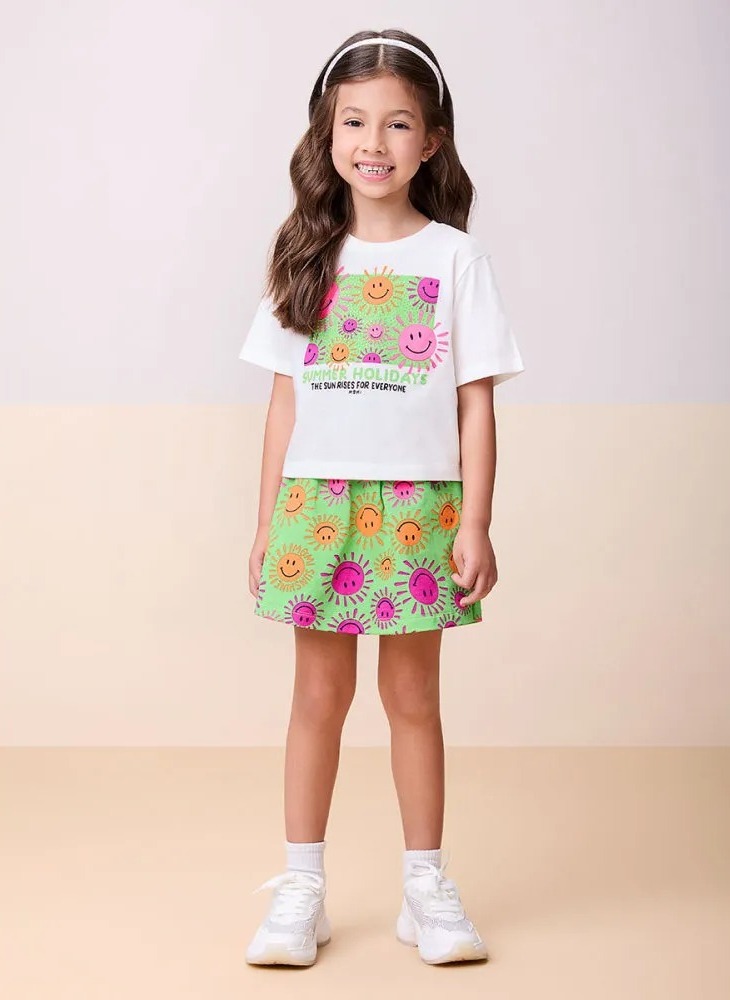 Prepare-se para aventuras do verão com nosso conjunto composto por uma blusa de manga curta em meia malha pérola com estampa summer, e um shorts com estampa rotativa.
