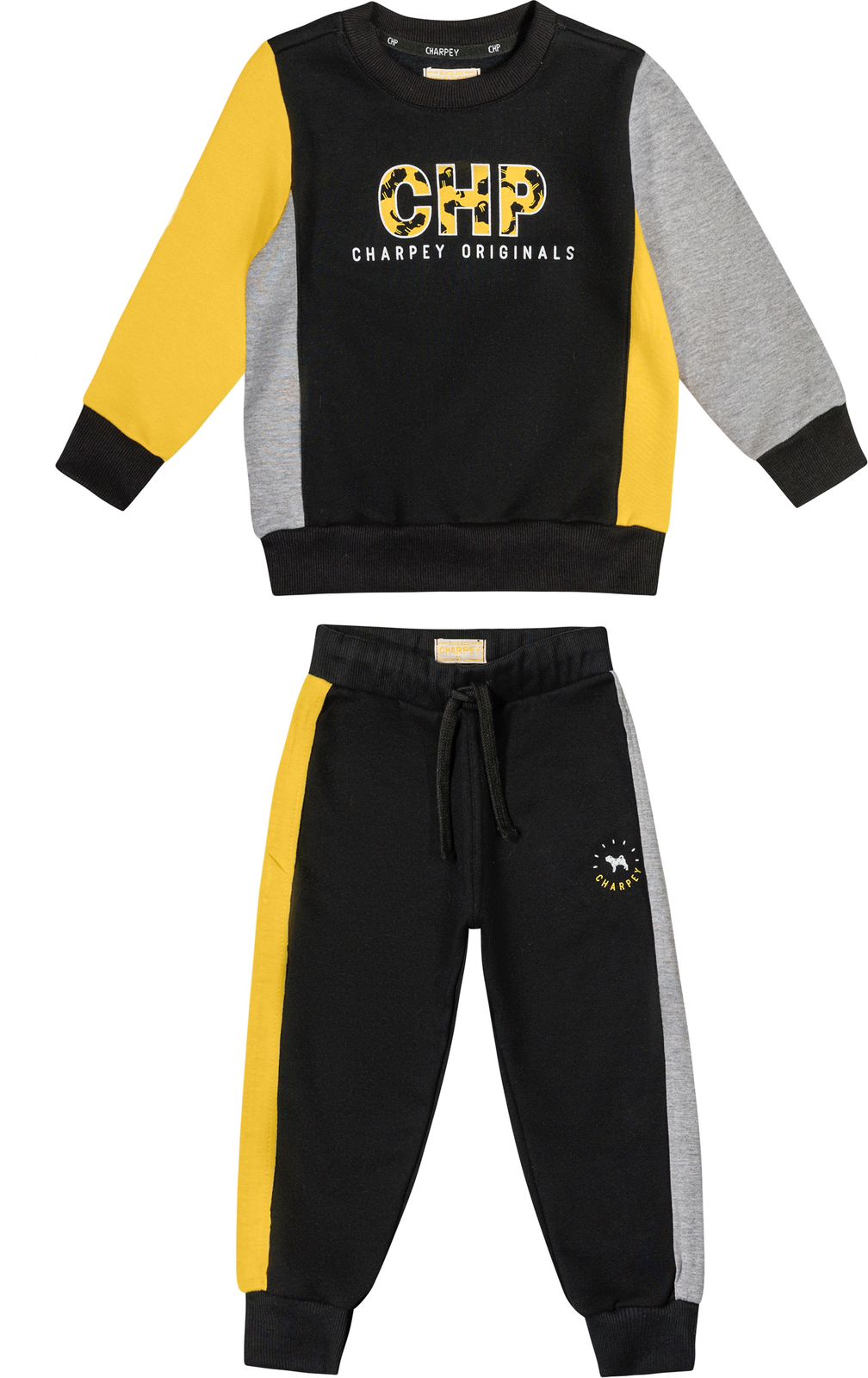 Conjunto blusão e calça. O blusão é uma peça de destaque, com sua combinação de três cores que adicionam dinamismo e estilo. A estampa da marca em efeito puff acrescenta uma dimensão extra ao design, destacando-se com originalidade e sofisticação. A calça, por sua vez, é projetada para combinar perfeitamente com o blusão. As faixas laterais em outra cor oferecem um toque de contraste e modernidade, enquanto a estampa minimalista da marca confere um acabamento elegante e discreto.