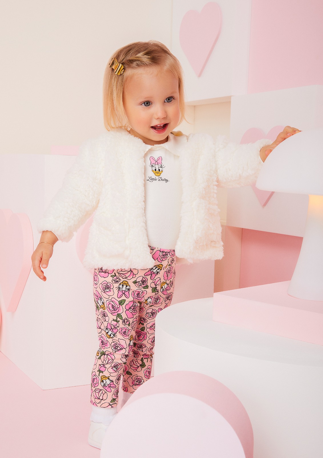 Conjunto infantil Momi Bebê, licenciado Disney, destaca a adorável personagem Daisy. Confeccionado em cotton, o conjunto oferece conforto e estilo para as pequenas. A abertura entrepernas com botão de pressão proporciona facilidade na troca. O elástico na cintura garante um ajuste perfeito, combinando praticidade com um toque charmoso.