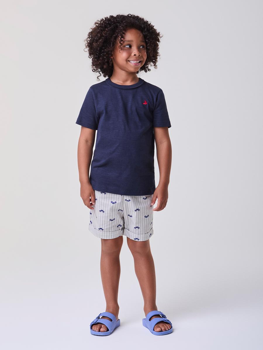 O conjunto infantil da Bimbi é perfeito para o verão. Com a camiseta azul marinho lisa com detalhe bordado, ele traz um visual leve e alegre. A bermuda listrada em tom claro dá o toque final à composição. Ideal para os pequenos que adoram looks descontraídos e frescos.
