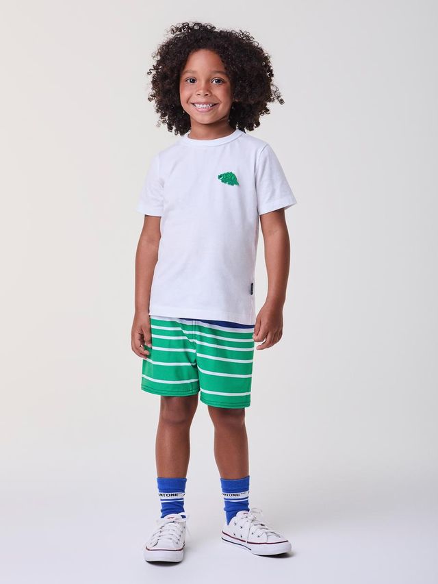 O conjunto infantil Off com bermuda listrada é perfeito para os pequenos que adoram animais e aventuras. A estampa divertida e discreta de dinossauro adiciona um toque lúdico, enquanto os tons de off white, azul e verde trazem sofisticação e estilo.
