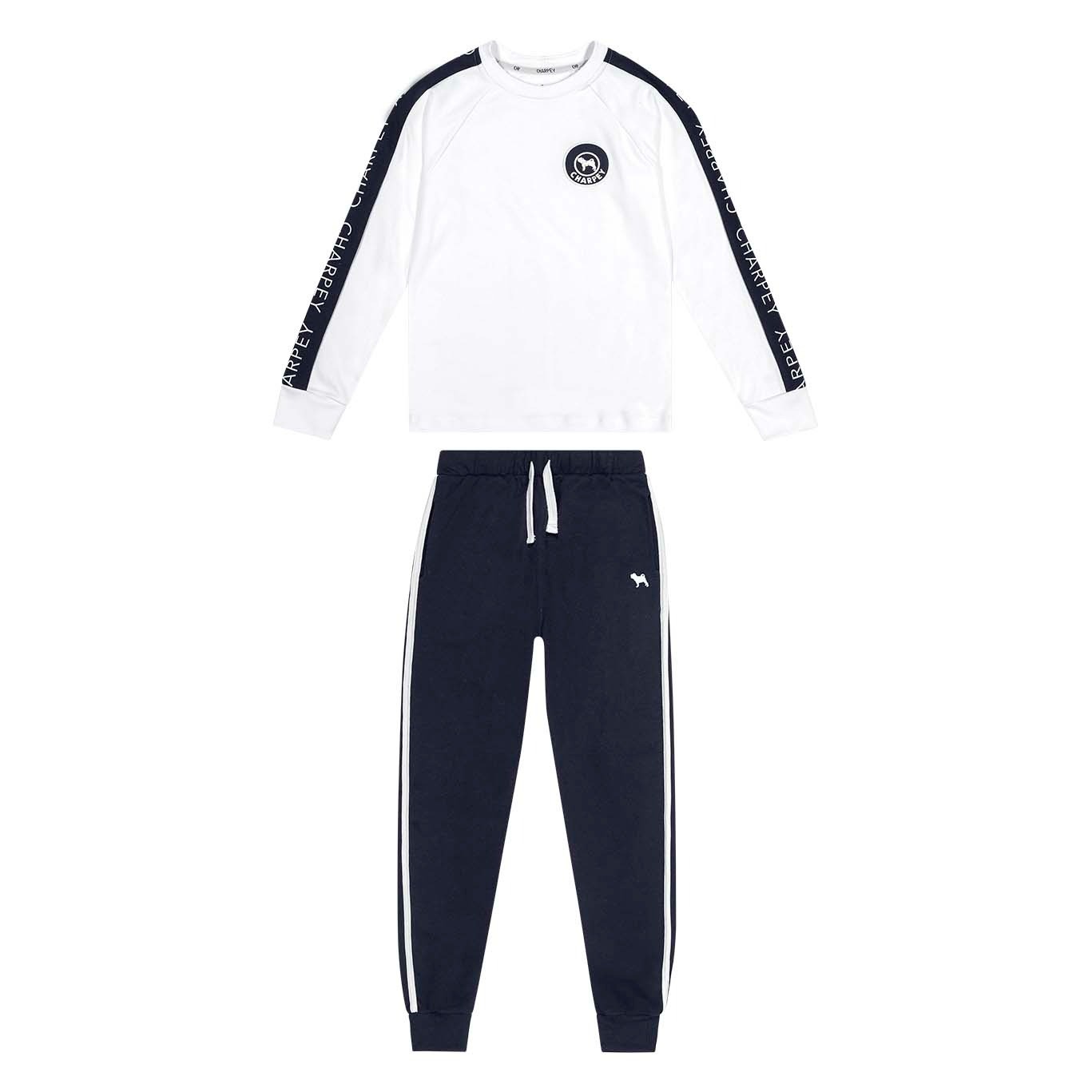 Conjunto composto por camiseta manga longa com punho em suedine e calça com elástico no cós e bolso funcional em piquê. Black & White é trend em todas as estações, com lettering Charpey na manga e estampa logo emborrachada é destaque no street style dos meninos.