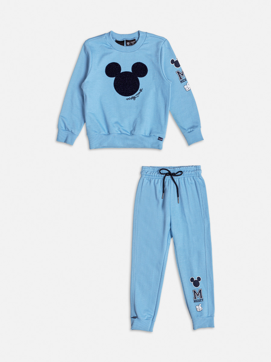 Conjunto azul Mickey Mouse é perfeito para os dias de frio com estilo. O moletom apresenta a clássica silhueta do Mickey com textura diferenciada e detalhes nos braços. A calça acompanha o visual, com punhos ajustados e estampa divertida que remete ao universo Disney. Ideal para momentos de conforto e diversão.