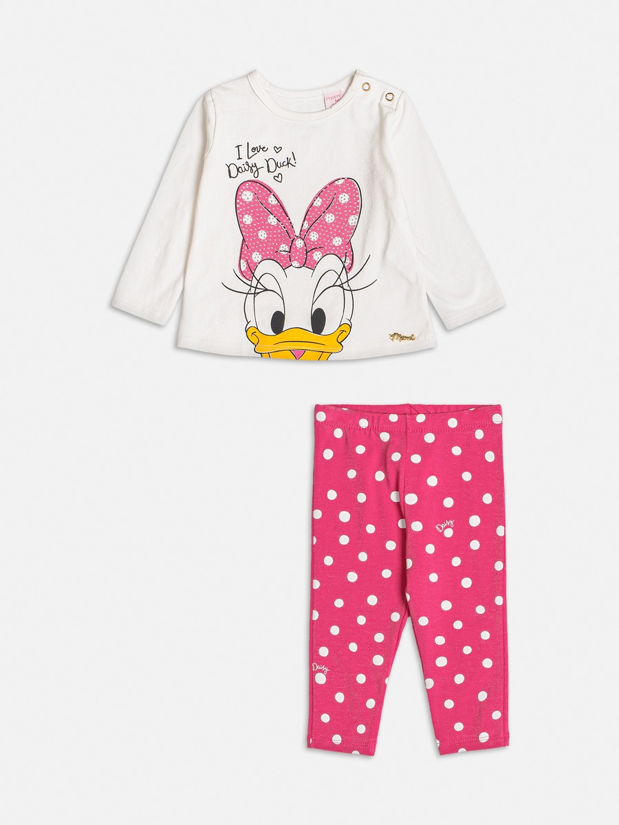 Conjunto Momi Bebê feito em cotton, licenciado pela Disney, traz estampa da adorável Daisy. A blusa, com aplicação de strass, adiciona brilho ao dia a dia das meninas. A legging de poá complementa o visual, garantindo conforto e estilo. Um conjunto encantador para as Momi Babys.