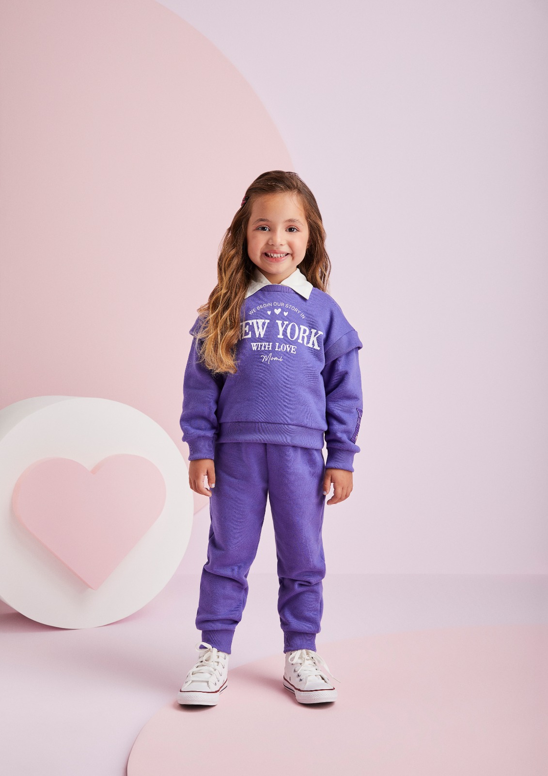 Dê um toque de charme aos momentos especiais com o conjunto roxo Momi. O casaco traz babado no ombro, estampa em lettering e ribana na gola, punho e barra. A calça proporciona leveza e conforto.