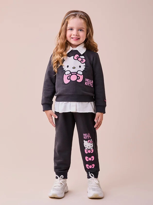 Este conjunto é puro conforto e estilo! Composto por um moletom preto estampado com a icônica Hello Kitty e uma calça com detalhe de lacinhos, é ideal para dias casuais. A modelagem moderna e o tecido macio garantem liberdade de movimento, enquanto os detalhes fofos trazem um toque especial ao visual. Uma escolha prática e estilosa para o dia a dia.