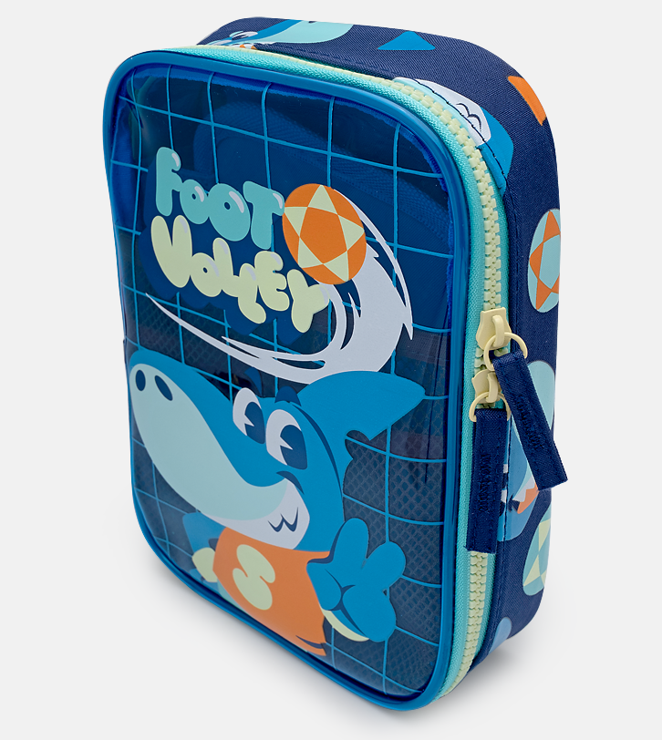Estojo grande em nylon. Parte frontal em PVC transparente estampa localizada de Tubarão.