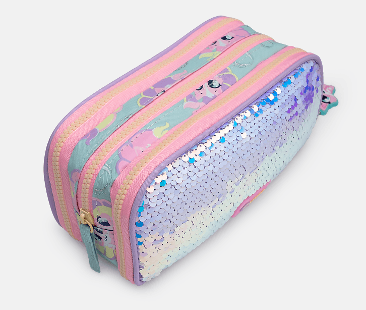 Estojo tripo, com estampa corrida de gata sereia, parte frontal em paetê reversível e puxador emborrachado de gata sereia no zíper.