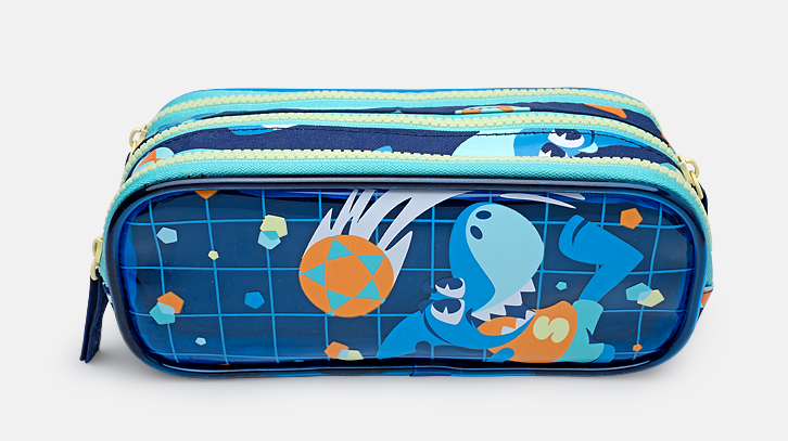 Estojo tripo, parte frontal em PVC telado com estampa de tubarão.