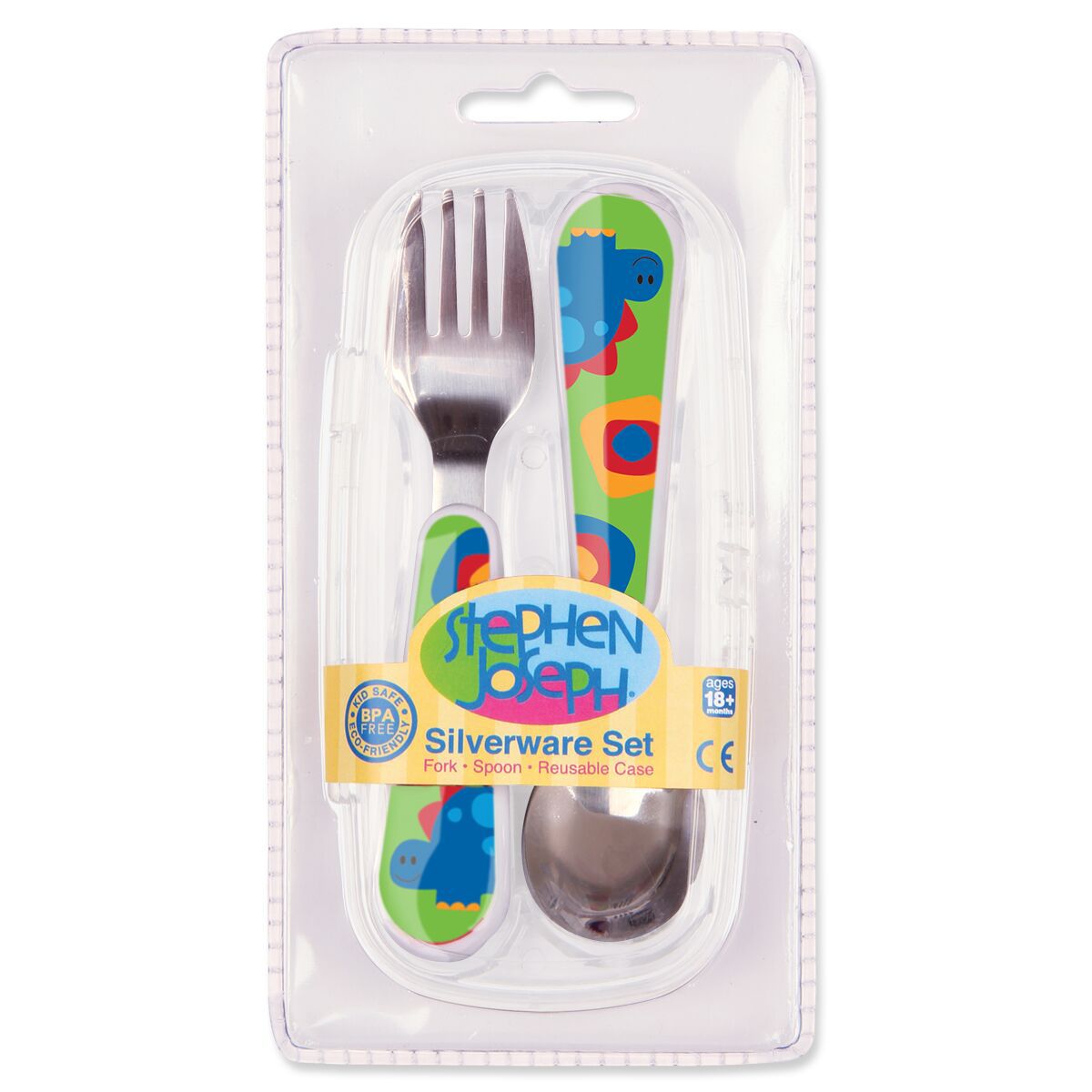 Talheres Stephen Joseph com laterais do cabo emborrachadas, que dão maior segurança para o bebê que esta aprendendo a comer.