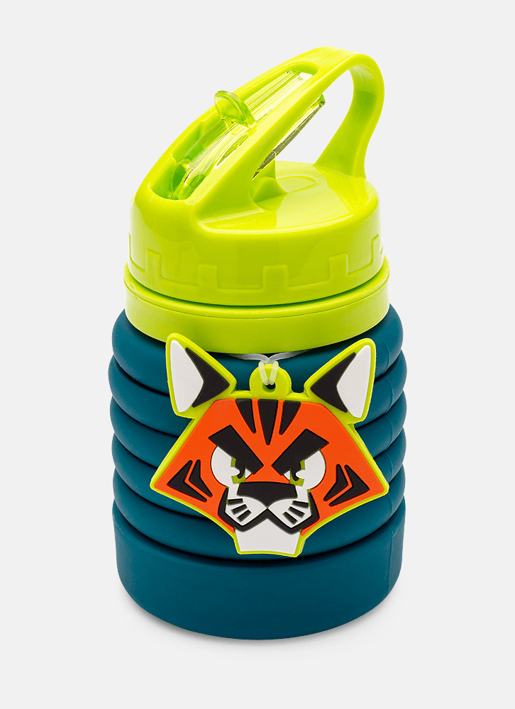 A garrafinha em silicone é linda e super prática, pois é retrátil (menor quando vazia). Possui tampa de rosquear com bico embutido e aplique emborrachado de Tigre.