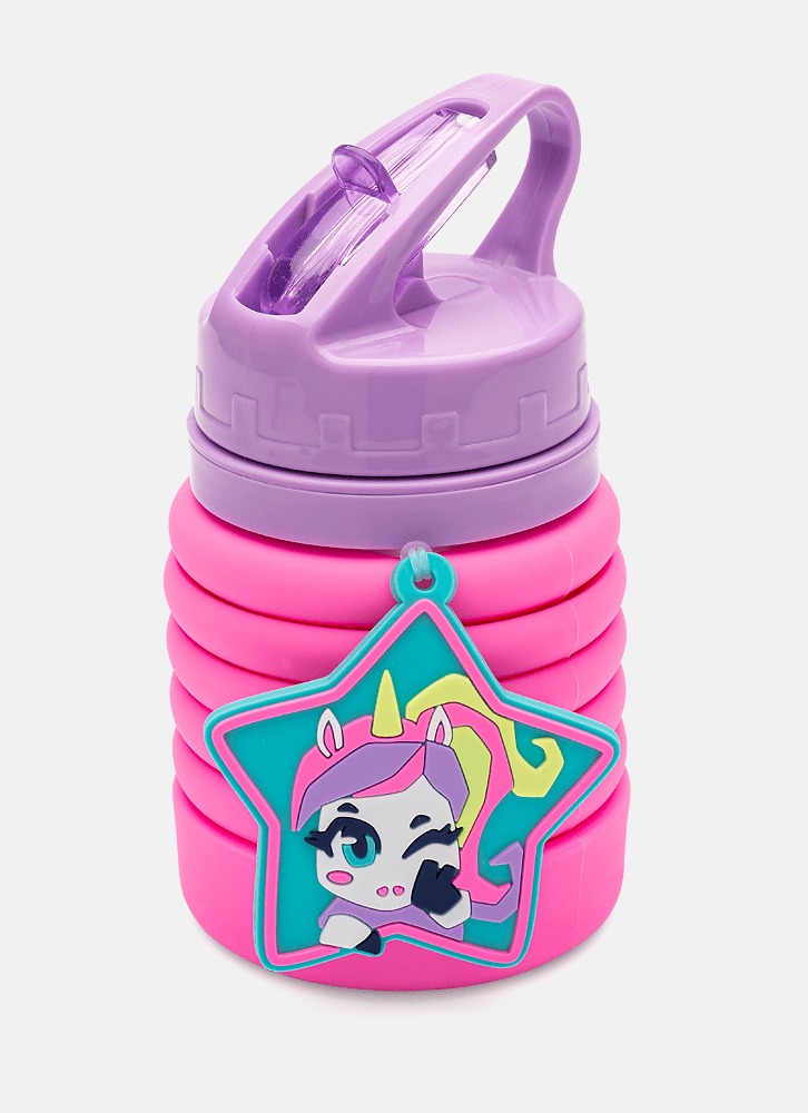 Possui forma retrátil (menor quando vazia), tampa de rosquear com bico embutido e aplique emborrachado de Unicórnio kawaii.