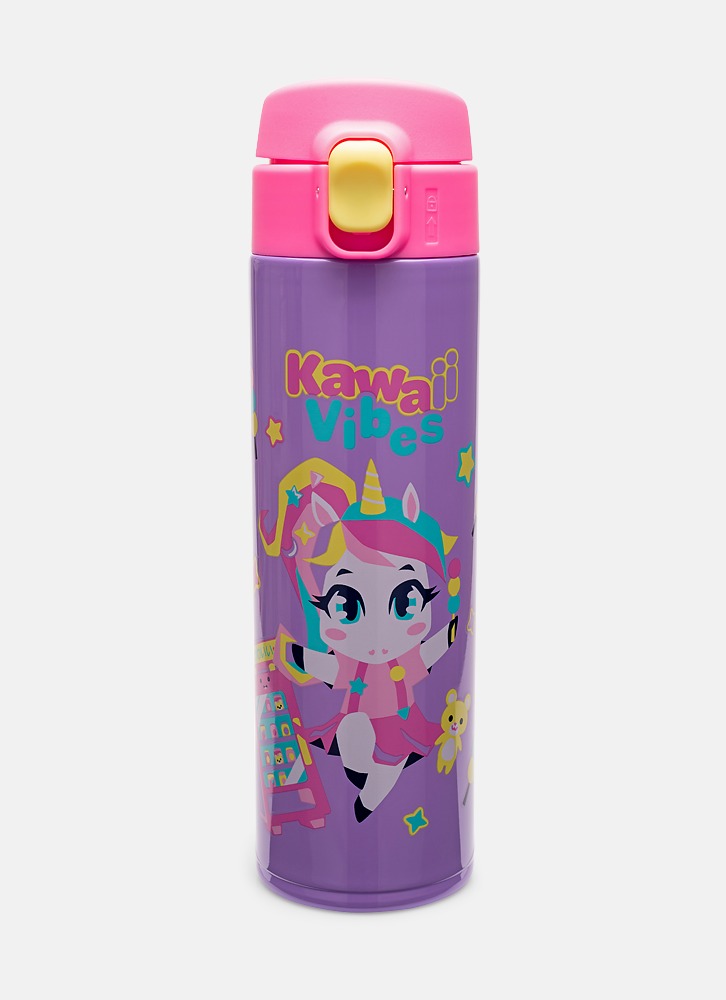 A garrafinha térmica em aço inox com estampa de Unicórnio possui tampa de rosquear externa e tampa interna com botão (à vácuo), além de ser estampada com ícones da coleção.