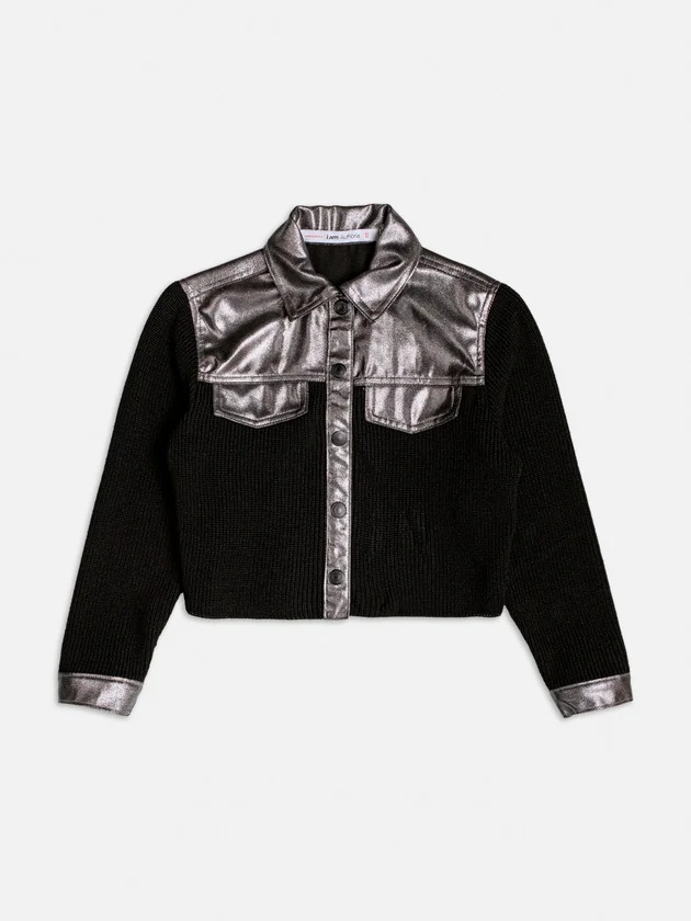 A jaqueta de tricot com recortes metalizados combina conforto e estilo em uma peça única. Os detalhes metalizados adicionam um toque moderno e glamoroso ao look.