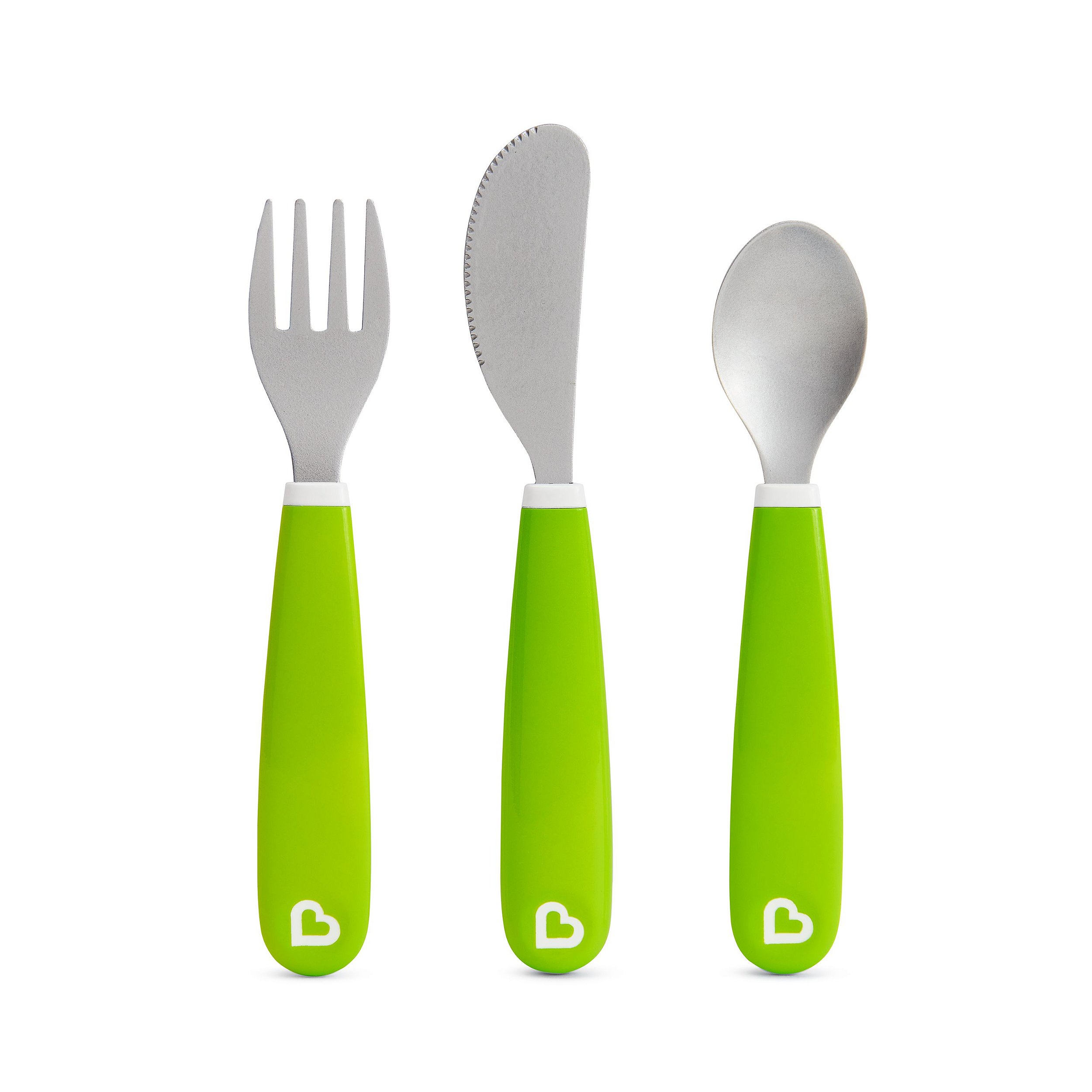Kit de Talheres em Inox Verde - Munchkin, a partir de 12 meses, sem BPA e com design ergonômico que se encaixa nas mãos da criança. Não use no micro-ondas, não esterilize a vapor, não ferva. Descarte e substitua no primeiro sinal de desgaste ou dano.