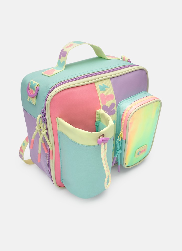 Lancheira em nylon color block, sem gel, com forro térmico. Possui bolso frontal pequeno em TPU holográfico e bolsinho para garrafinha na parte da frente. Acompanha cartela de adesivos para customização.