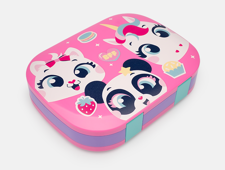 Marmita Grande em formato retangular de borda arredondada, tampa de encaixe com estampa de Multibichos. Acompanha 1 garfo e 1 colher de plástico.