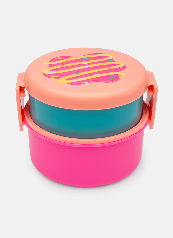 Marmita pequena em formato redondo com dois andares, tampa de encaixe com estampa de Donuts. Acompanha 1 garfo de plástic