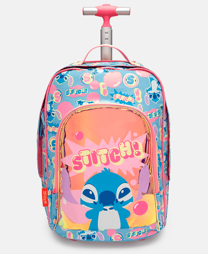 Mochila em nylon com rodinha e estampa corrida do Stitch. Bolso frontal médio em TPU holográfico, bolsinho lateral pra garrrafinha, alça de mão e puxador com duas alturas de regulagem.