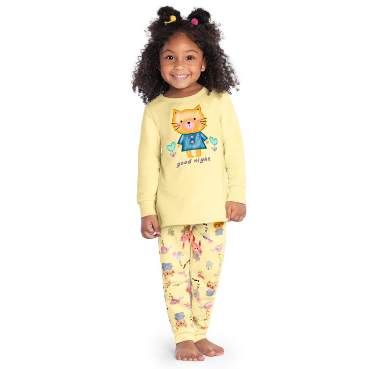 A Blusa Infantil Feminina Kyly possui modelagem trapézio, divertida estampa frontal com detalhes que brilha do escuro, mangas longas com punho em molde e acabamento no decote com debrum. A Calça Infantil Feminina Kyly possui modelagem soltinha, estampa rotativa de estrela, barra em molde e cós com elástico para o conforto da criança.
