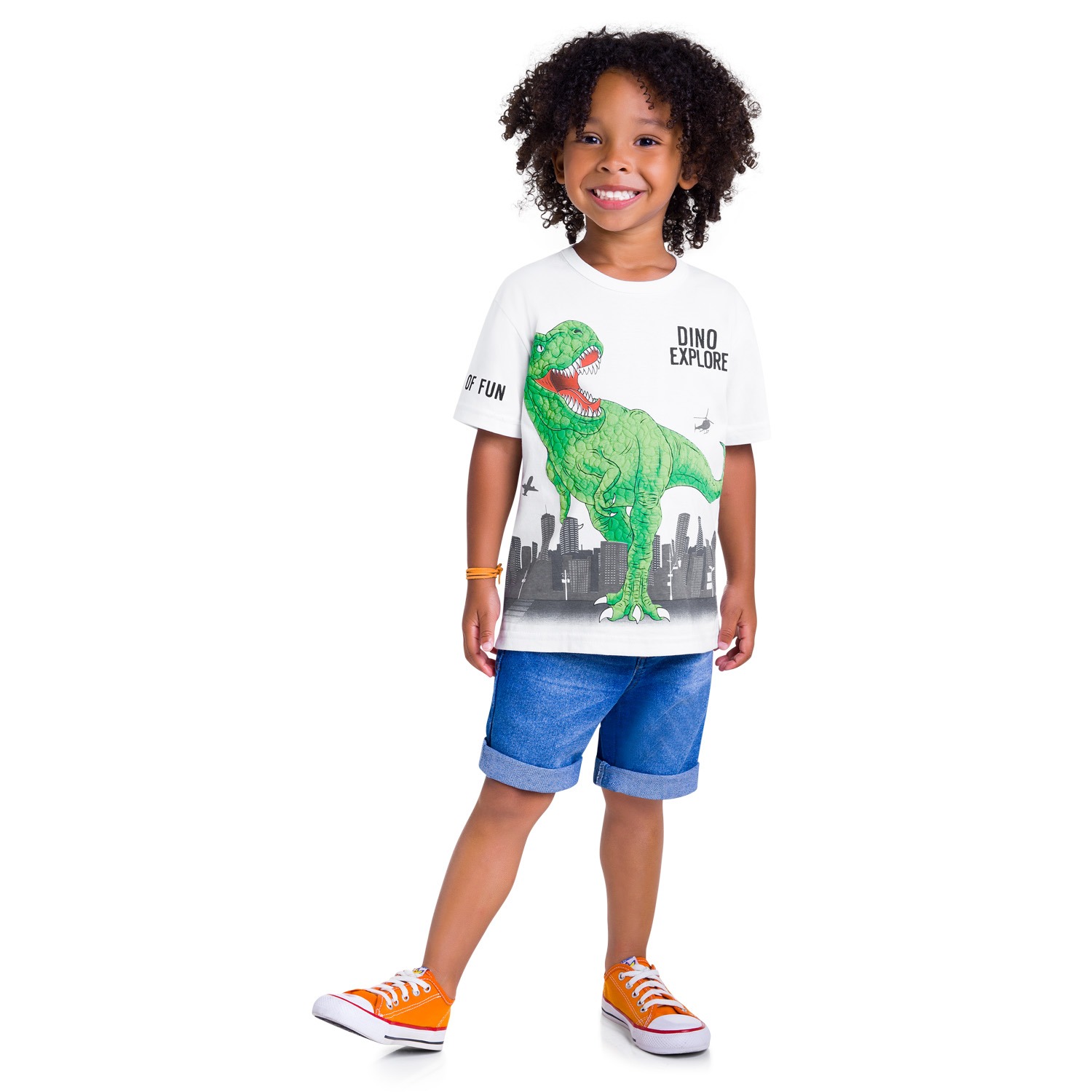 Camiseta Infantil Masculina Kyly confeccionada em Meia Malha, possui modelagem tradicional e estampa frontal dinossauro.