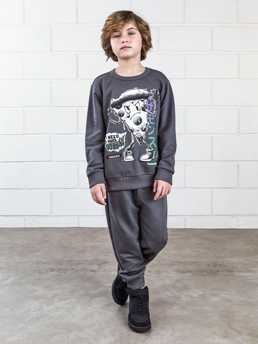 O Conjunto Infantil Youccie Cinza Escuro confeccionado em moletom sem felpa com modelagem básica, é composto por blusa e calça com estampa de pizza.