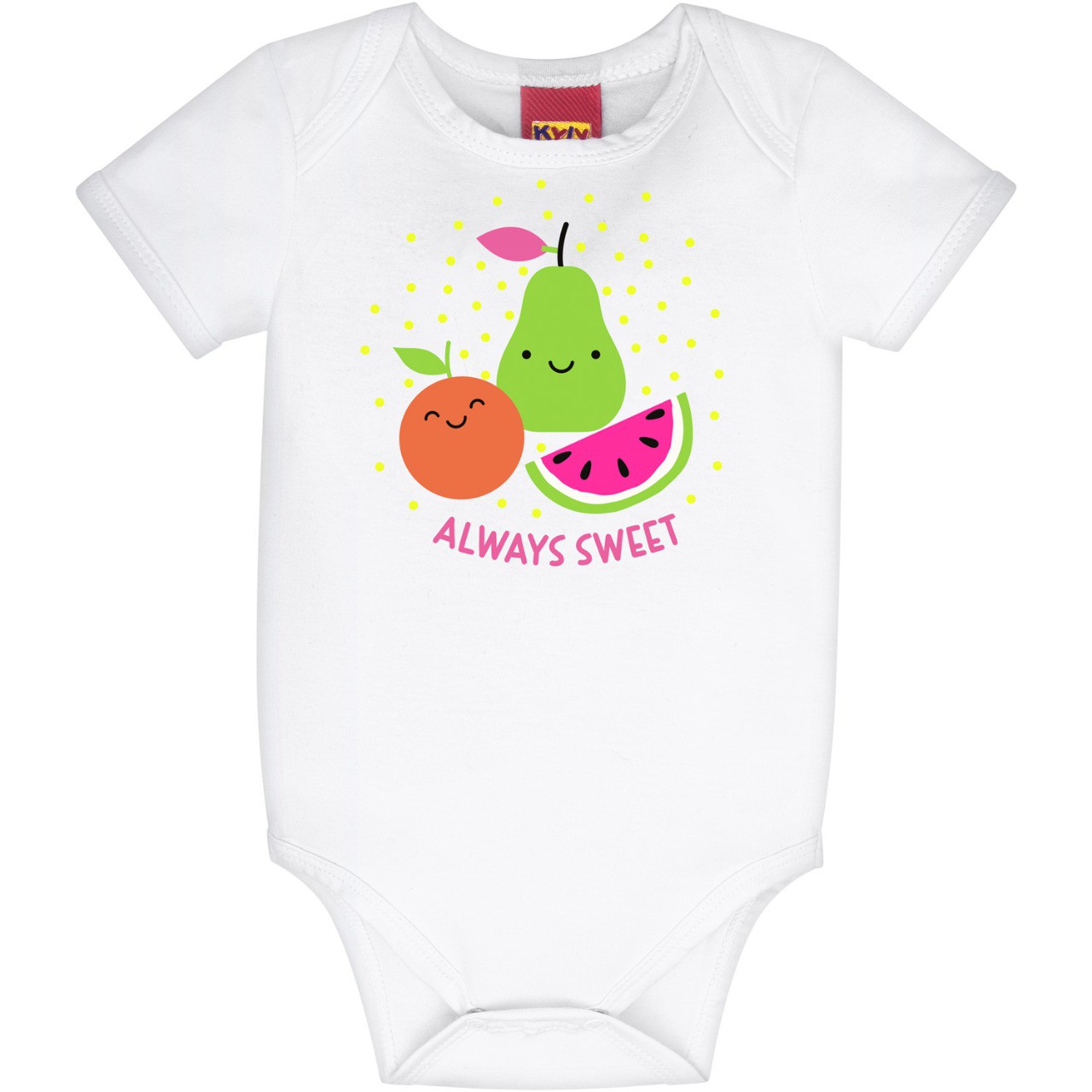 O Body Bebê Feminino Kyly possui estampa frontal de frutas com enchimento, ombros transpassados e abertura entrepernas por botões de pressão. O Short Bebê Feminino Kyly possui estampa rotativa de frutas e elástico confortável no cós.