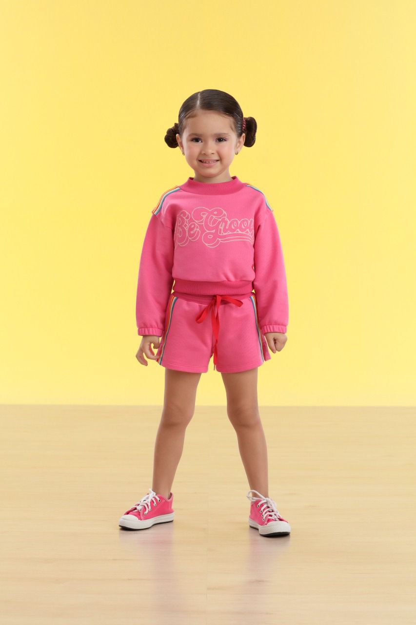 Conjunto Infantil em moleton leve, sendo a blusa pink manga longa e um detalhe lindo colorido no ombro e o mesmo detalhe na lateral do short.