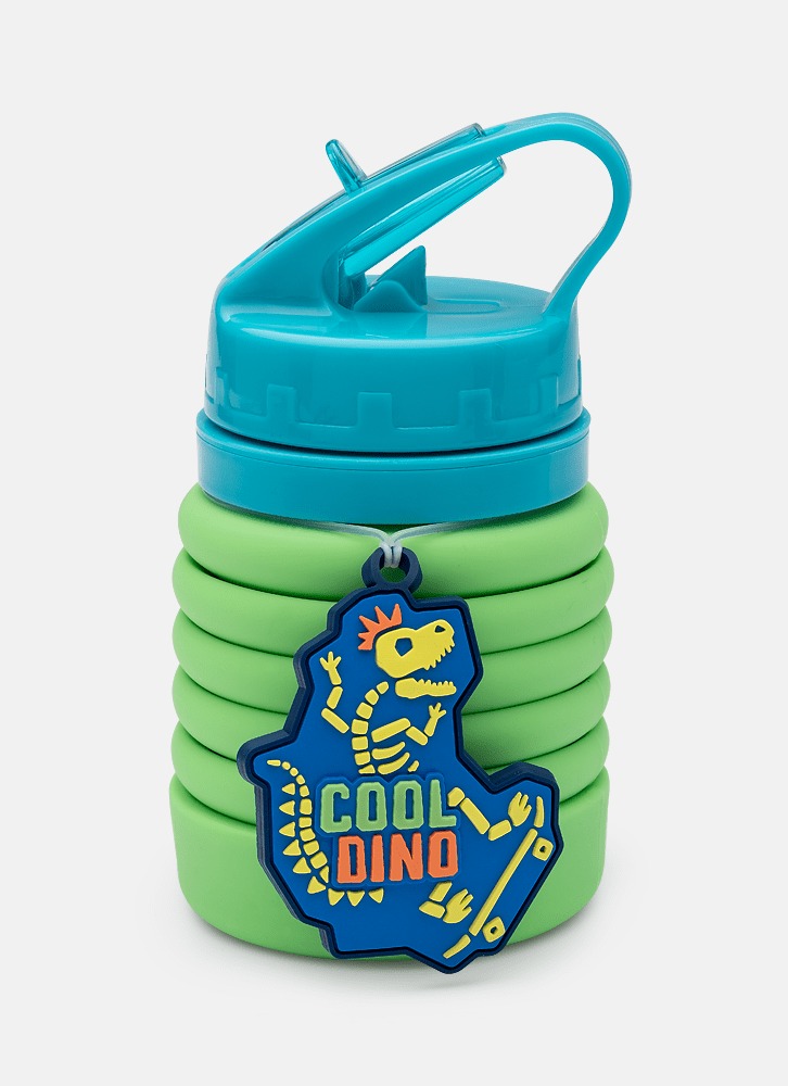 Possui forma retrátil (menor quando vazia), tampa de rosquear com bico embutido e aplique emborrachado de Dinossauro.