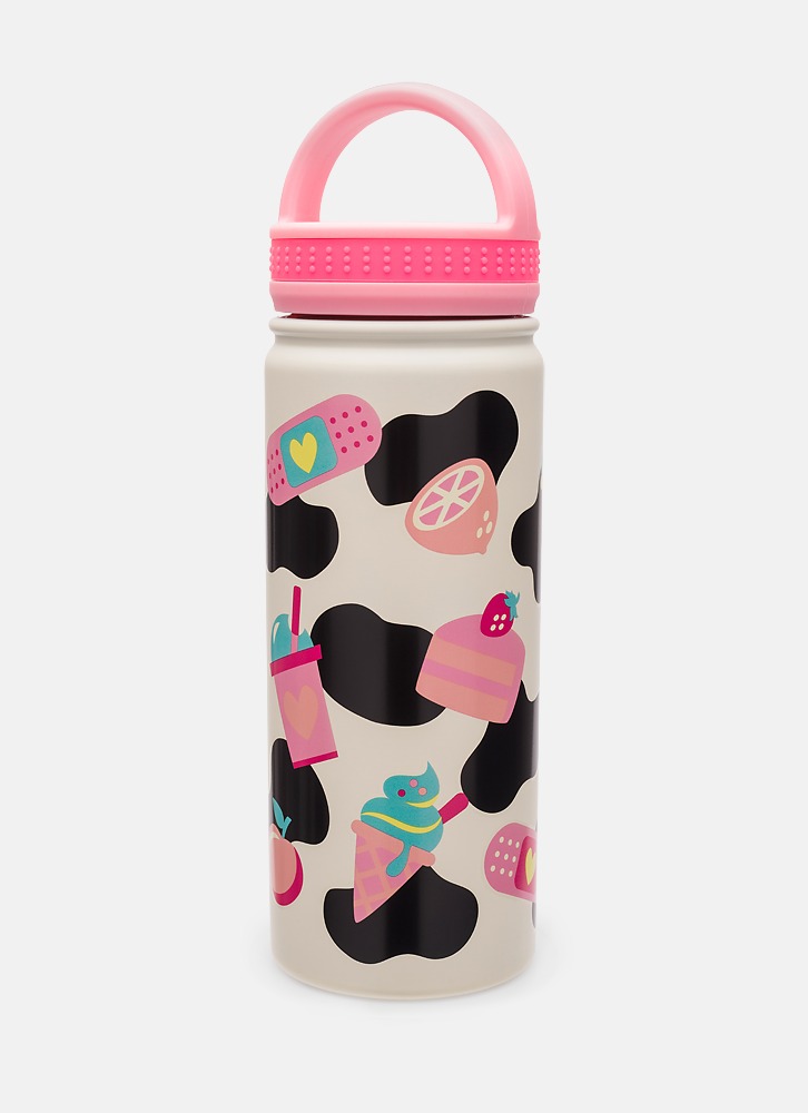 Garrafinha térmica em aço inox. Possui tampa de rosquear externa e alça fixa. Estampa de manchinhas de vaca.