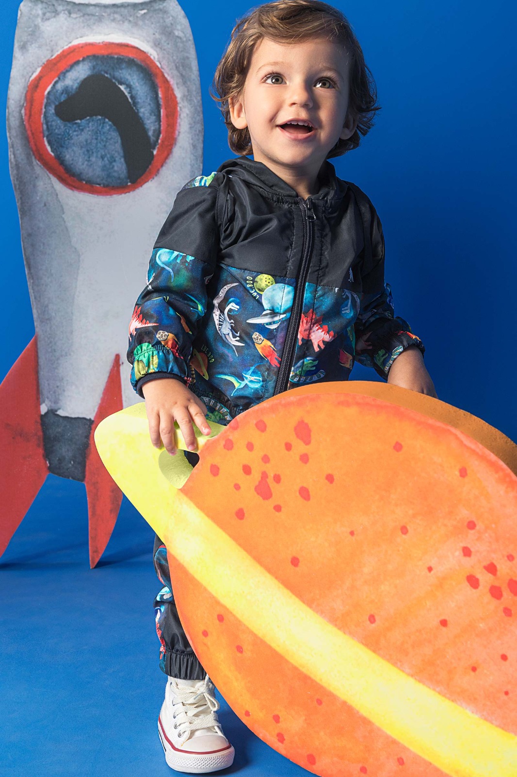 Este trio é composto por uma jaqueta de manga longa, uma calça e uma bolsa com design foguete, todos desenvolvidos com atenção aos detalhes e pensados especialmente para atender às necessidades do seu filho.