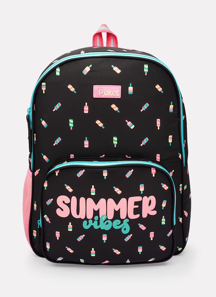 Mochila sem rodinha Panda Summer em nylon acetinado com estampa corrida. Possui 2 compartimentos principais e, 1 bolso frontal.