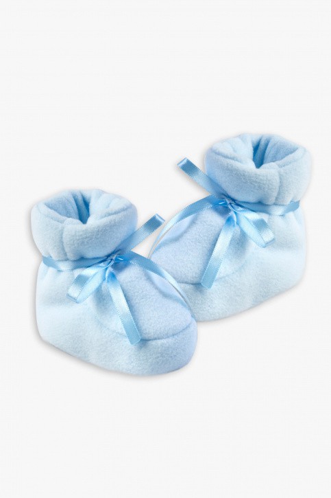 Pantufa de soft bebê menino na cor azul bebê. Fita de cetim azul bebê para ajuste nos pés.