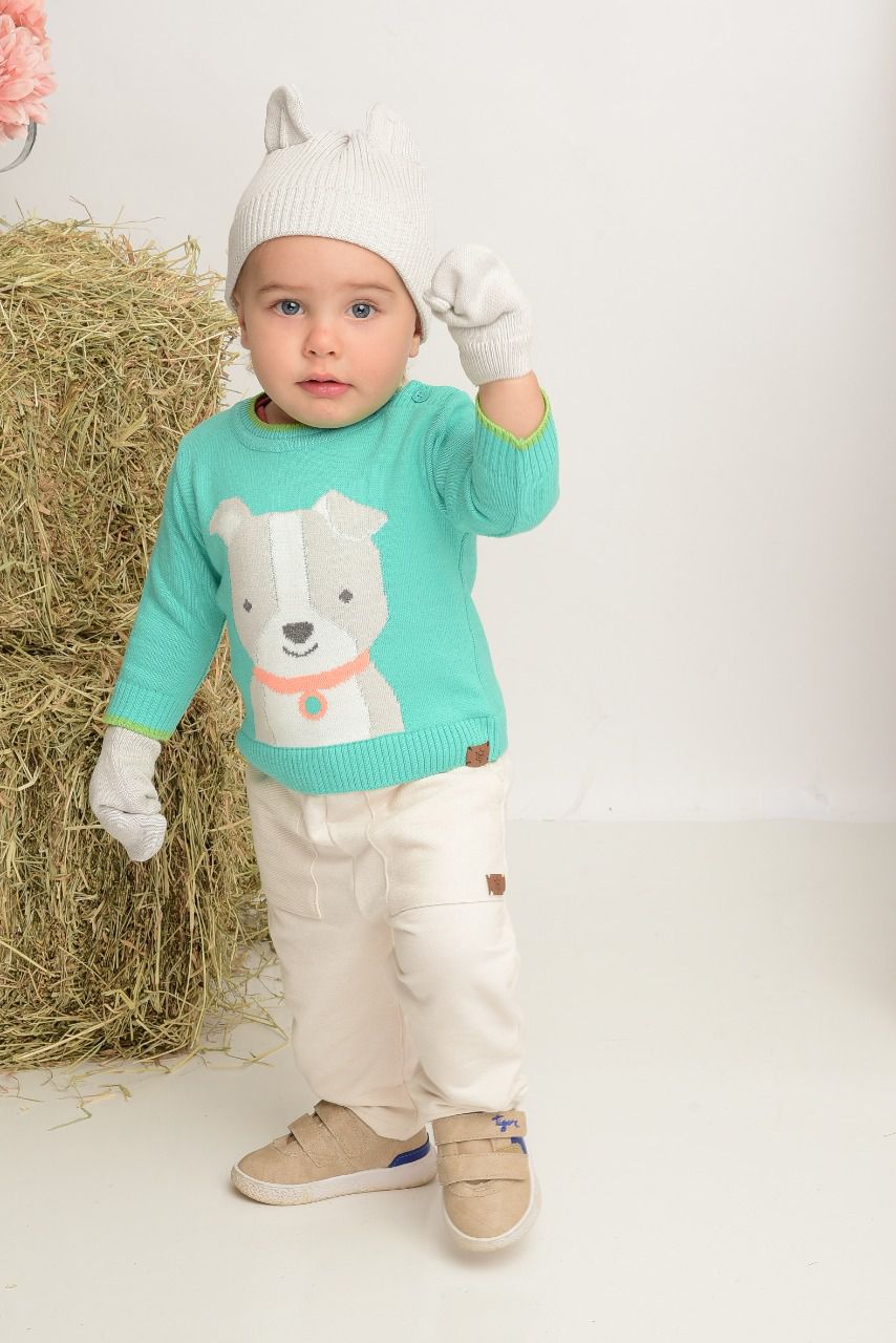 O Suéter Infantil Tricô Masculino Mini Lord com estampa de cachorrinho, desenvolvido com fios da mais alta qualidade, para proporcionar conforto, com um toque leve e macio sobre a pele do seu bebê.