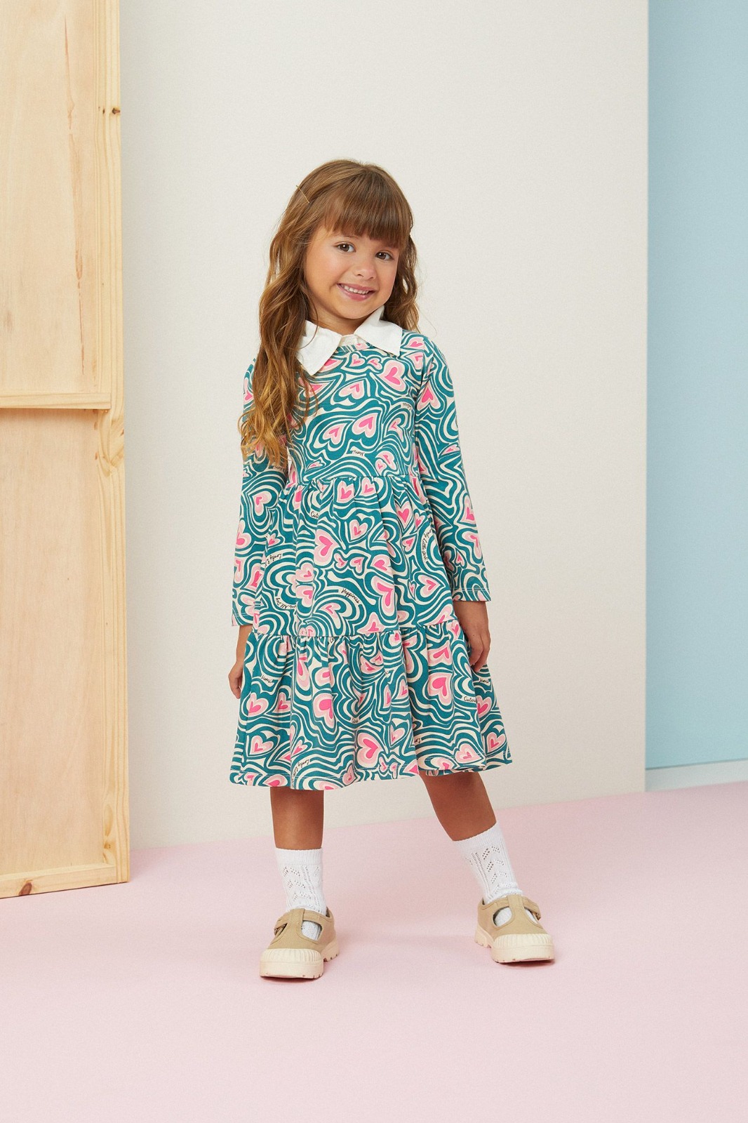 Este vestido é feito de algodão macio e confortável em um tom de verde. Com estampa de corações abstratos em rosa, o design é moderno do jeitinho que elas amam. A manga longa oferece proteção a mais contra o frio, enquanto os babados na saia adicionam um toque charmoso. Este vestido é perfeito para uso diário e pode ser facilmente combinado com acessórios para um look fashion.