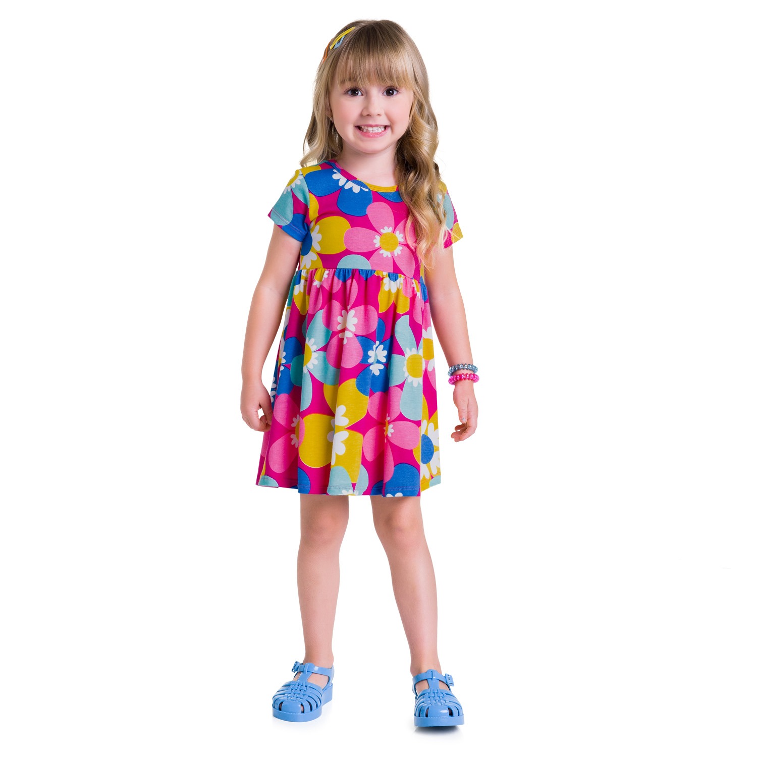 Vestido Infantil Kyly confeccionado em Meia Malha, possui recorte de pala com franzido deixando a peça soltinha, divertida estampa rotativa de flores e acabamento no decote com debrum.