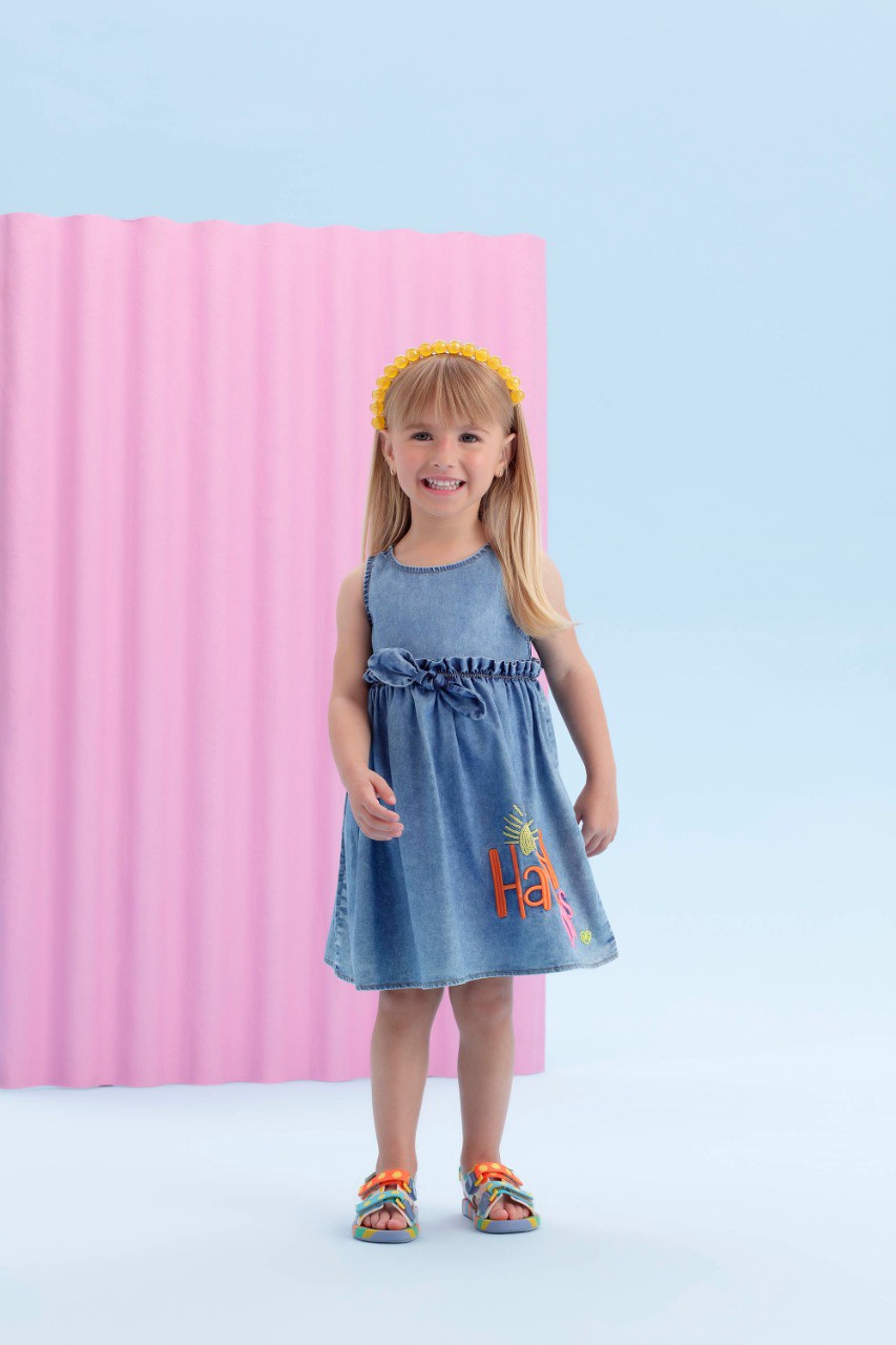 Vestido Infantil Jeans Mon Sucré Duplo Sunday. Vestido em jeans bem molinho e confortável com fecho nas costas por botões.