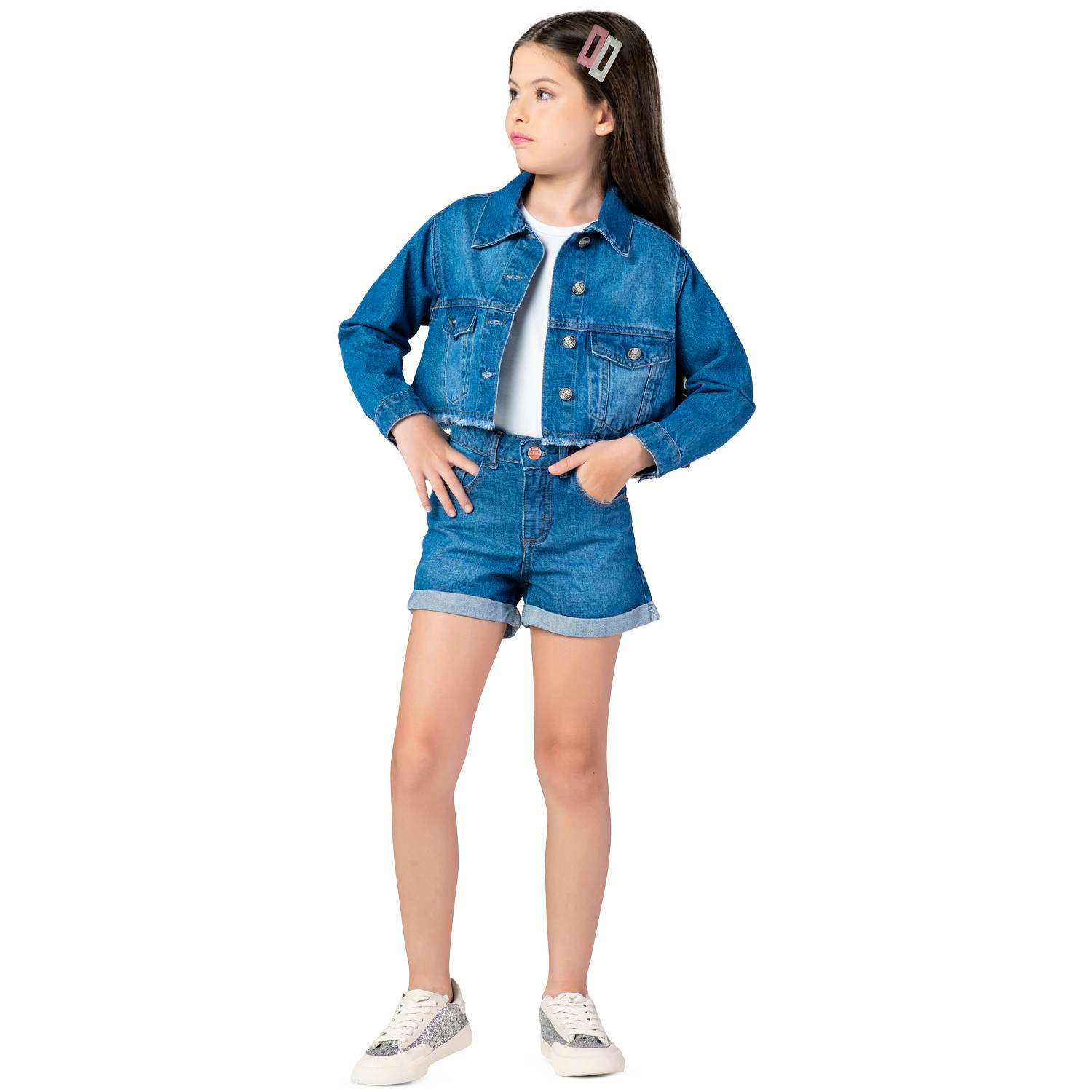 Shorts Jeans Menina Mania Kids. Com barra virada, bolsos e fechamento por botão.