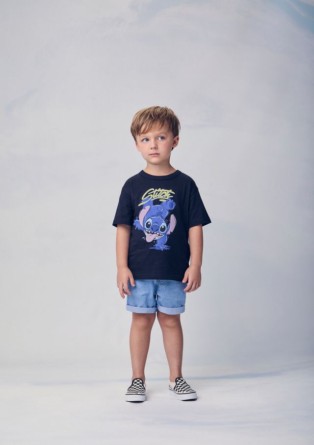 A camiseta preta entra na cena com uma pegada vibrante, destacando a estampa do Stitch em traços gráficos e efeito neon. Um modelo que traduz a energia descontraída do verão com atitude e estilo, ideal para explorar memórias à beira-mar ou passeios urbanos.