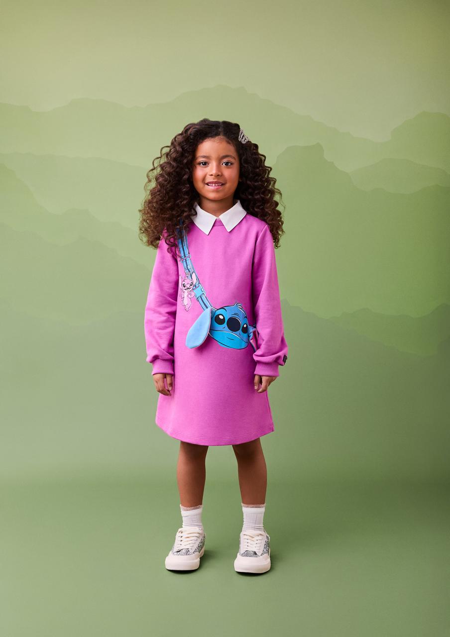 Este stitch chega cheio de personalidade neste vestido encantador! Com estampa divertida simulando uma alça de bolsa e detalhes em 3D nas orelhinhas, a peça ainda conta com a companhia da Angel, deixando tudo mais fofo. O tom vibrante e a modelagem confortável completam o look perfeito para passeios cheios de estilo.